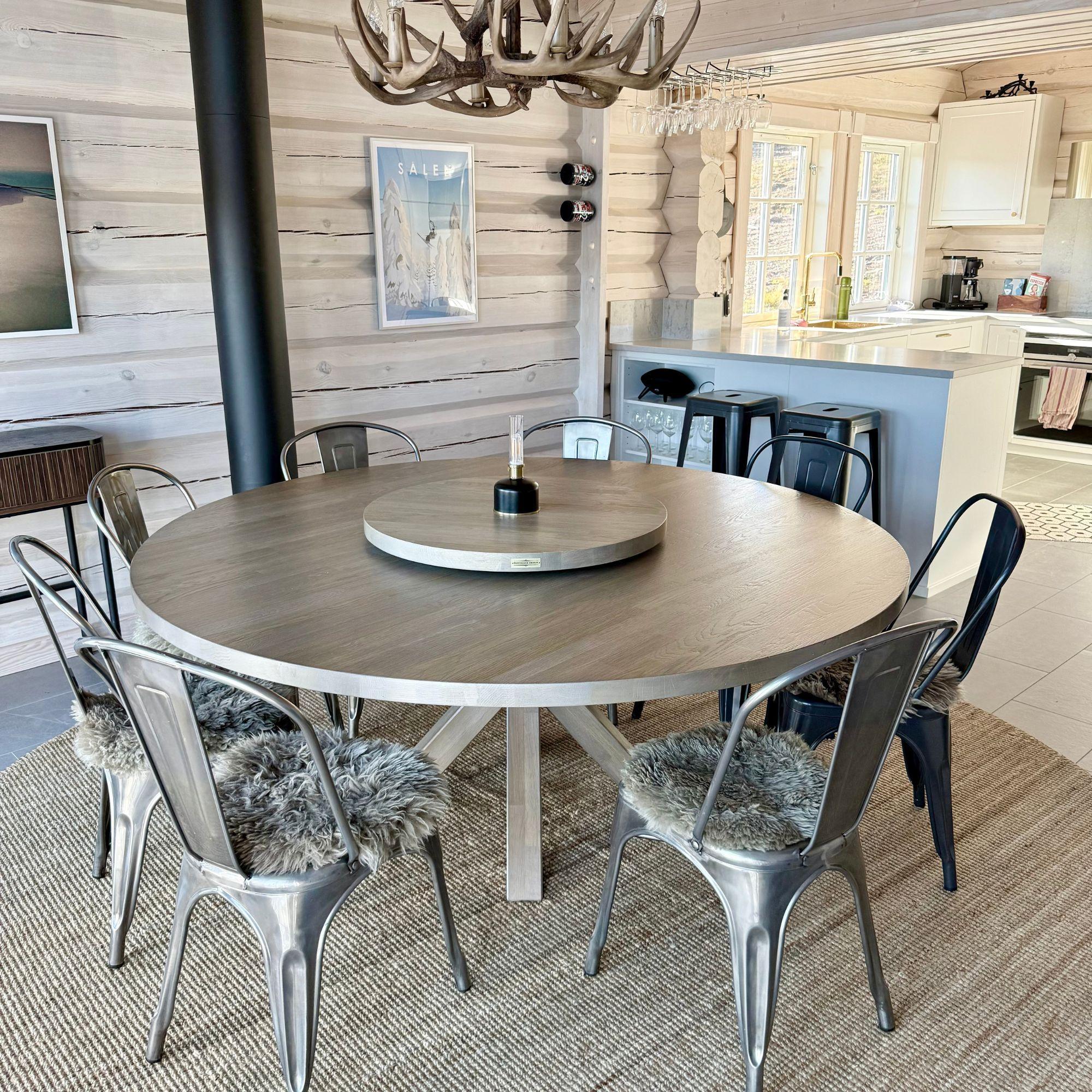 I stugans öppna planlösning står ett maffigt runt matbord i massiv ek, kulören silvergrå, med plats för 8–10 personer. Det runda formatet gör sig extra bra i fjällstugor där kök, vardagsrum och matplats ofta flyter samman till ett och samma rum. Massiv ek är ett av de mest slitstarka möbelmaterialen som finns och är extra populärt att använda i fjällstugor som hyrs ut, andelsstugor och i stugor där det bor barnfamiljer.