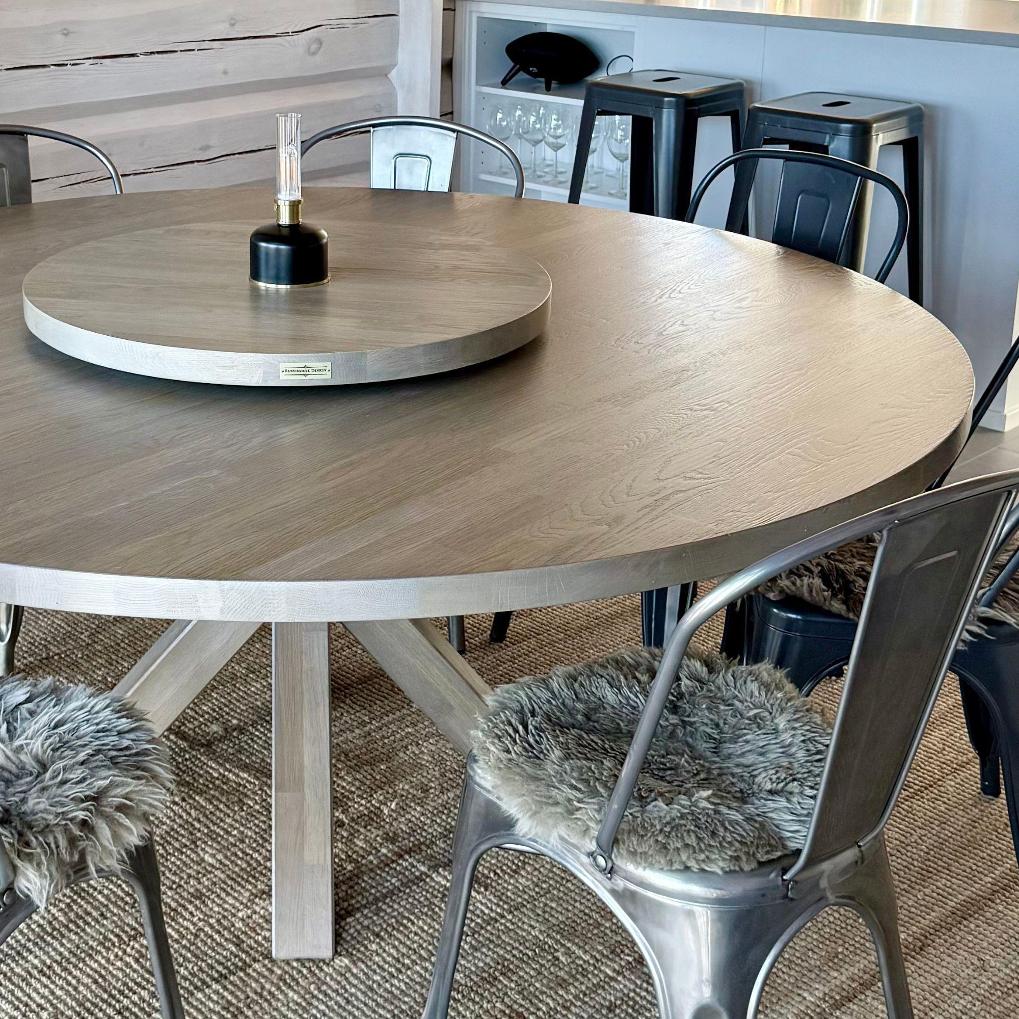 På bordet står en generös snurrbricka på 70 cm i diameter – en detalj som gör måltiderna både enklare och mer sociala. Snurrbrickan fungerar för frukostbuffén, tapas, raclette, barnens yoghurt, spelkvällens snacks och allt däremellan. Den gör att bordets stora yta kan utnyttjas maximalt utan att någon behöver sträcka sig.