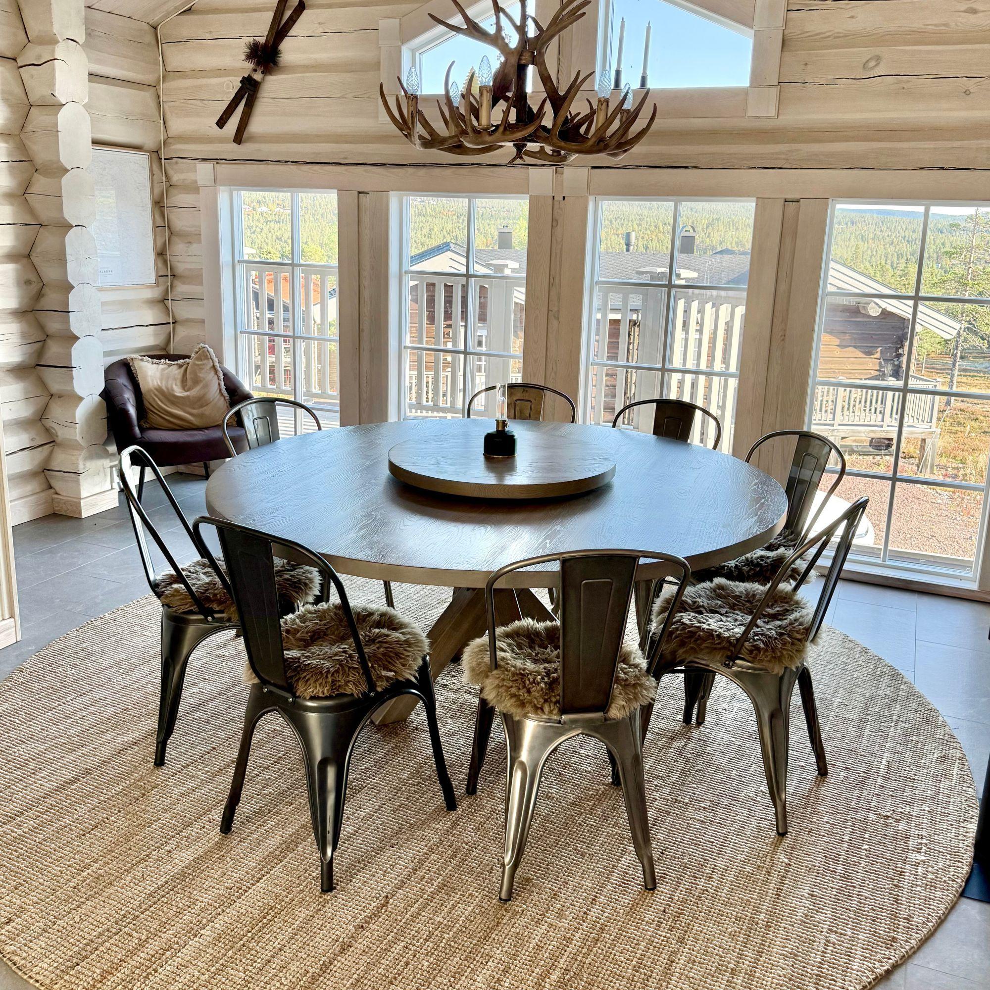 Stugan har inretts med naturnära toner och material som jute, konstpäls och trä. Det skapar ett lugnt och varmt helhetsintryck, där matplatsen blir en självklar mittpunkt för samtal, skratt och långa stunder tillsammans. Det runda bordet skapar ett naturligt flöde i rummet – perfekt när man har mycket rörelse, skidkläder, barn, hundar och gäster. Dessutom tar runda bord förvånansvärt lite plats i förhållande till hur många som kan sitta runt dem. Det gör dem idealiska i både en stor och liten fjällstuga med öppen planlösning.