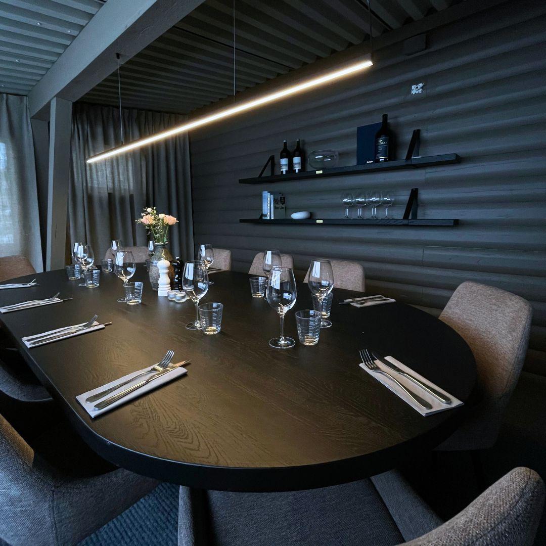 Till restaurangens chambre separée tillverkades ett stort ovalt matbord i massiv ek och grafitsvart kulör, som skapade en exklusiv och avskild sittplats för större sällskap.