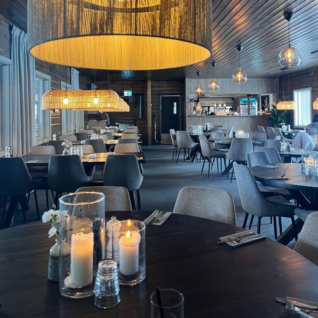 Restaurangen inreddes med både runda matbord med kryssben och rektangulära matbord med kryssunderrede i träslaget gran och kulören tjära. Storleken på matbordet planerades för att ge restaurangen ett yteffektivt och trevligt intryck. Baren kläddes in i ribbor tillverkade i samma träslag och kulör som matborden, för ett enhetligt och lugnt intryck.