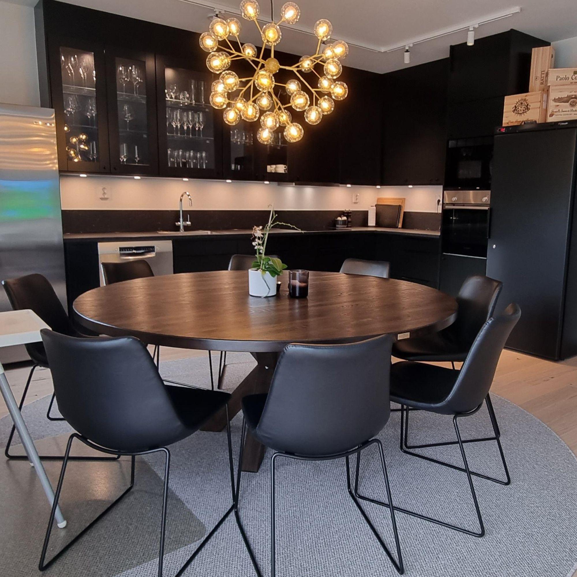 Runda stora matbord bjuder in till samtal och gemenskap. Alla sitter nära varandra, ser varandra och ingen hamnar “på hörnet”. De passar perfekt i öppna planlösningar eller kvadratiska rum, där cirkelformen mjukar upp rummets linjer. Ett stort runt matbord, till exempel 160 cm i diameter, blir dessutom ett vackert blickfång.
